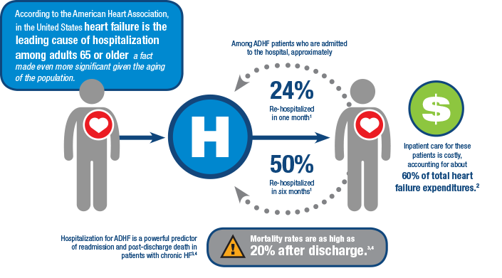 1. Krumholz HM, Merrill AR, Schone EM, et al. Patterns of hospital performance in acute myocardial infarction and heart failure 30-day mortality and readmission. Circ Cardiovasc Qual Outcomes. 2009;2(5):407–413. 2. Michota FA Jr, Amin A. Bridging the gap between evidence and practice in acute decompensated heart failure management. J Hosp Med. 2008;3(suppl):S7-S15. 3. Ahmed A, Allman RM, Fonarow GC, Love TE, Zannad F, Dell’italia LJ, et al. Incident heart failure hospitalization and subsequent mortality in chronic heart failure: a propensity-matched study. J Card Fail 2008;14(3):211–8. 4. Solomon SD, Dobson J, Pocock S, Skali H, McMurray JJ, Granger CB, et al. Influence of nonfatal hospitalization for heart failure on subsequent mortality in patients with chronic heart failure. Circulation 2007;116(13):1482–7. 5. Majure DT, Teerlink JR. Update in management of acute decompensated heart failure. Current Treatment Options in Cardiovascular Medicine. 2011 Oct 6. 6. Mebazaa A, Parissis J, Porcher R, Gayat E, Nikolaou M, et al. (2011) Short-term survival by treatment among patients hospitalized with acute heart failure: the global ALARM-HF registry using propensity scoring methods. Intensive Care Med 37: 290–301 doi:10.1007/s00134-010-2073-4.